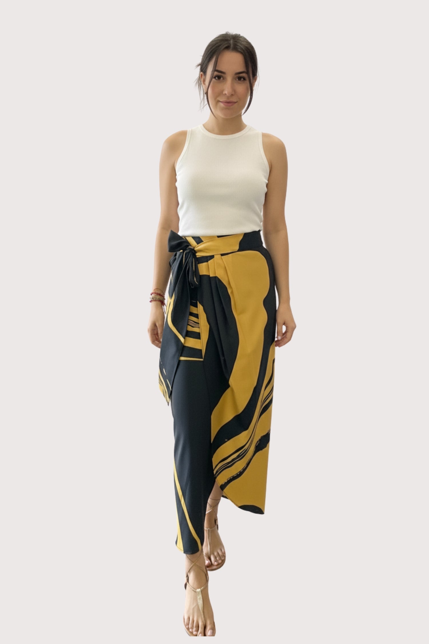 Falda estilo pareo, de horma semi ajustada, enresortada en la parte trasera y de anudar en la parte delantera.