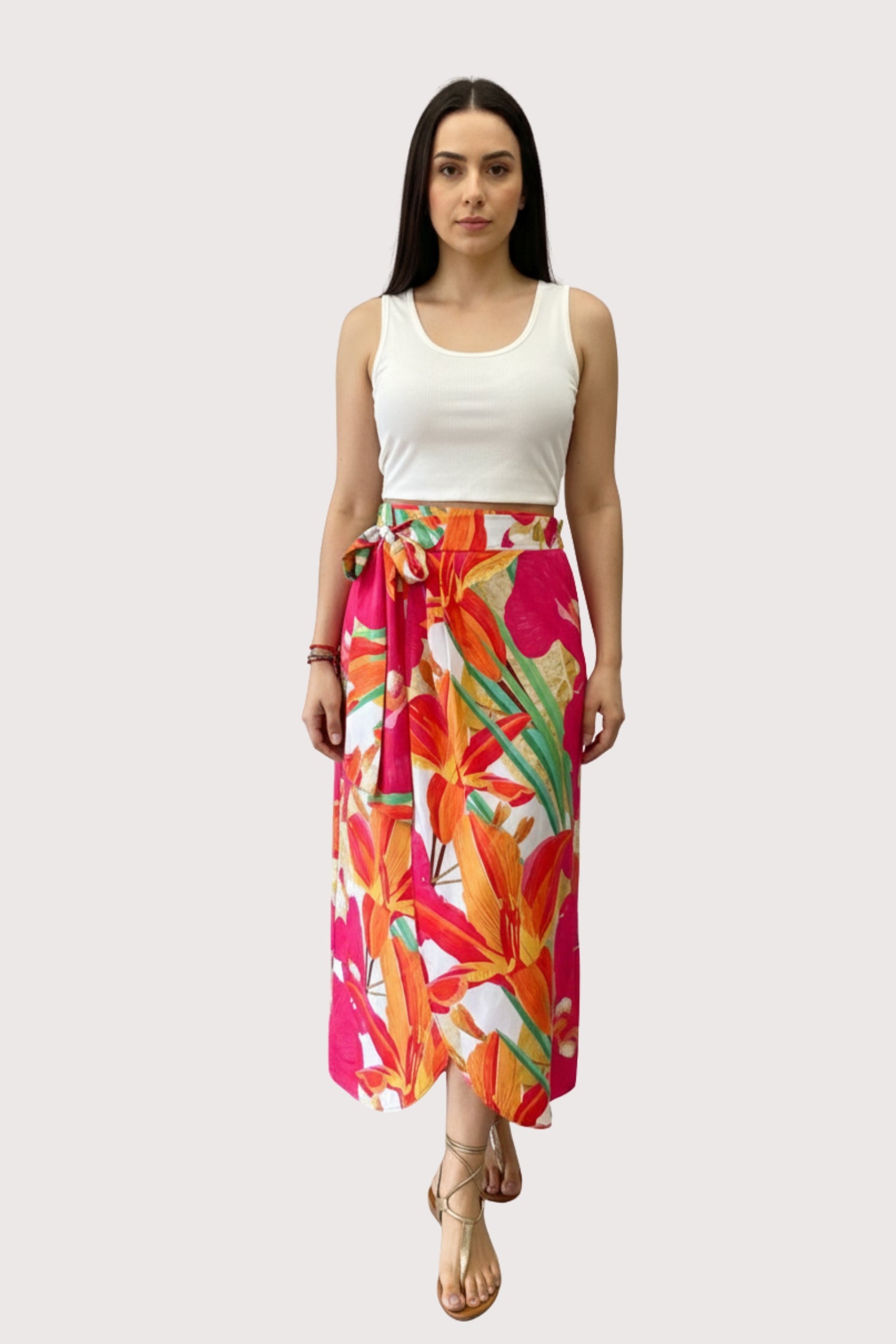 Falda estilo pareo, de horma semi ajustada, enresortada en la parte trasera y de anudar en la parte delantera.